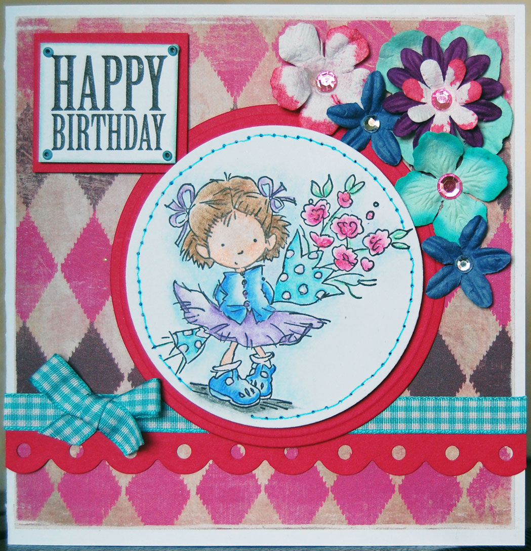 I have chosen to use bleach and water as my spotlight, not as easy as you would think, but several "tries" later, I got there. I have added some backing of sticky ribbon on and some heart buttons. The Sentiment is bleached as well. I added some foil to her hair band and dress, to give it a bit of sparkle