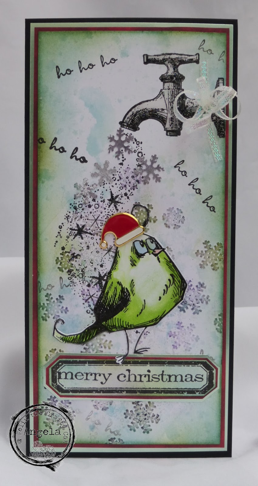 I used an embossing folder for the snowflakes on this card and heat embossed the crazy bird before colouring with alcohol pens. Full details of how I made this are on my blog.