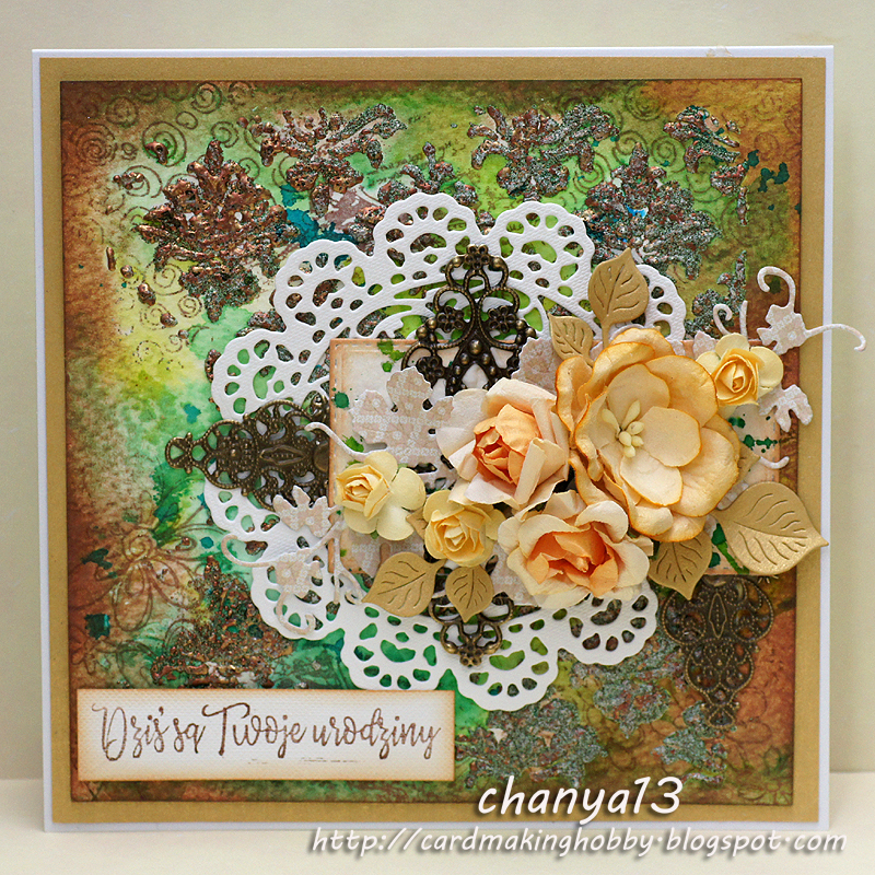 Today I made mixed-media card. At the beginning my background was a pice of white paper. I used watercolor paper. I splashed it with liquid water color ( green and dark green), later I postmarked it with some images and used stencil. I applayed gel medium and covered it with embossing powder. Next I used some distress ink - tea dye. I also added some metal embellishments.