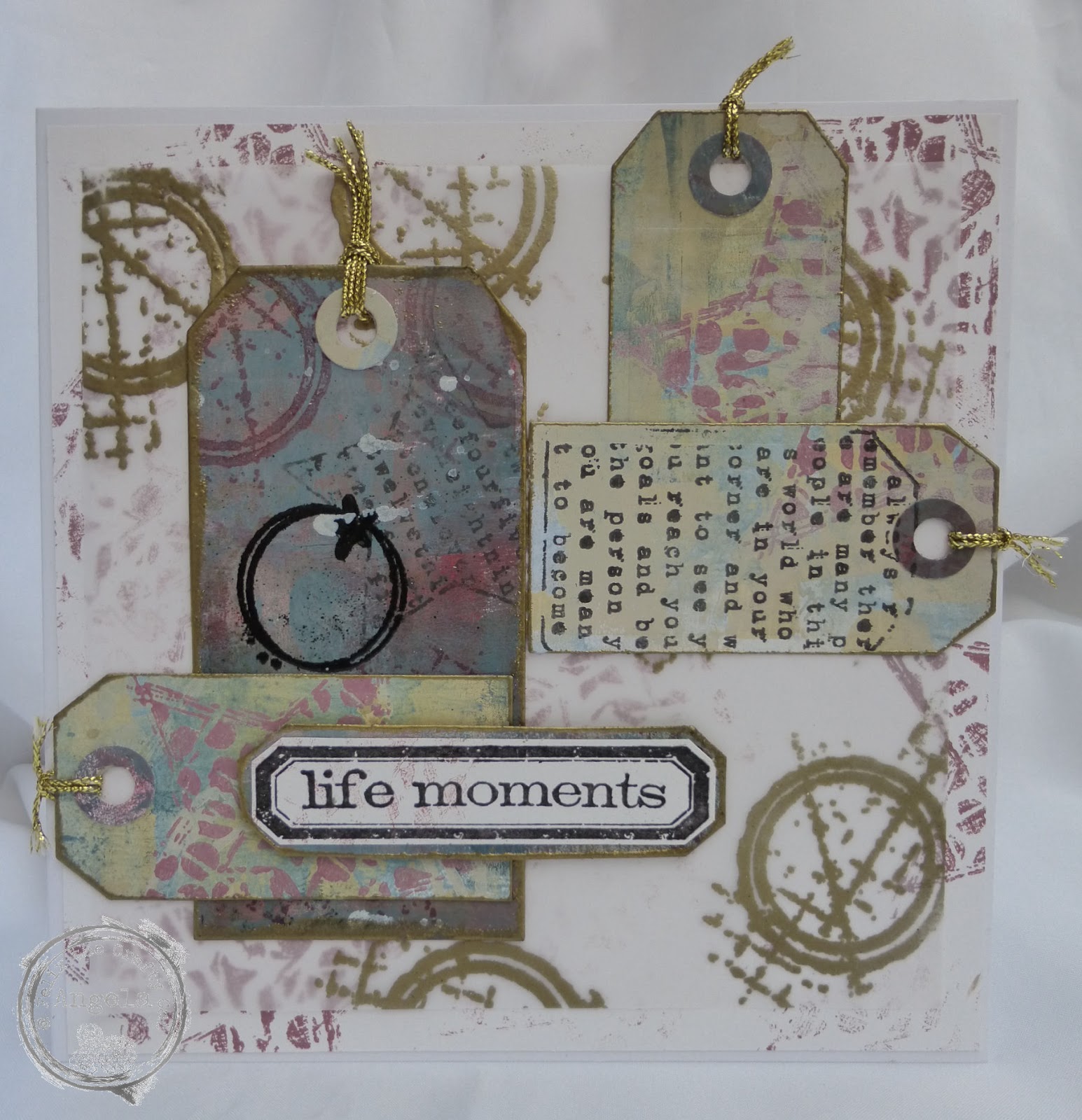Mostly Seth Apter stamps for this card and the Tim Holtz Life Moments tag. The background is one of my masterboards layered with stamped Velum and tags. You may have to twist your head slightly to read the main sentiment as it's on the centre tag. Happy crafting, Angela x