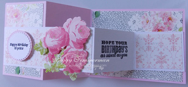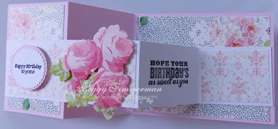 My card is a Double Z fold card. The tutorial for it can be found At Beccy's Place. The background paper is from the new Anna Griffin Eleanor paper pad. I cut all elements except the flower with my Cricut Explore. The Happy Birthday sentiment was created in Design Space and the inside sentiment is a Close To My Heart stamp.