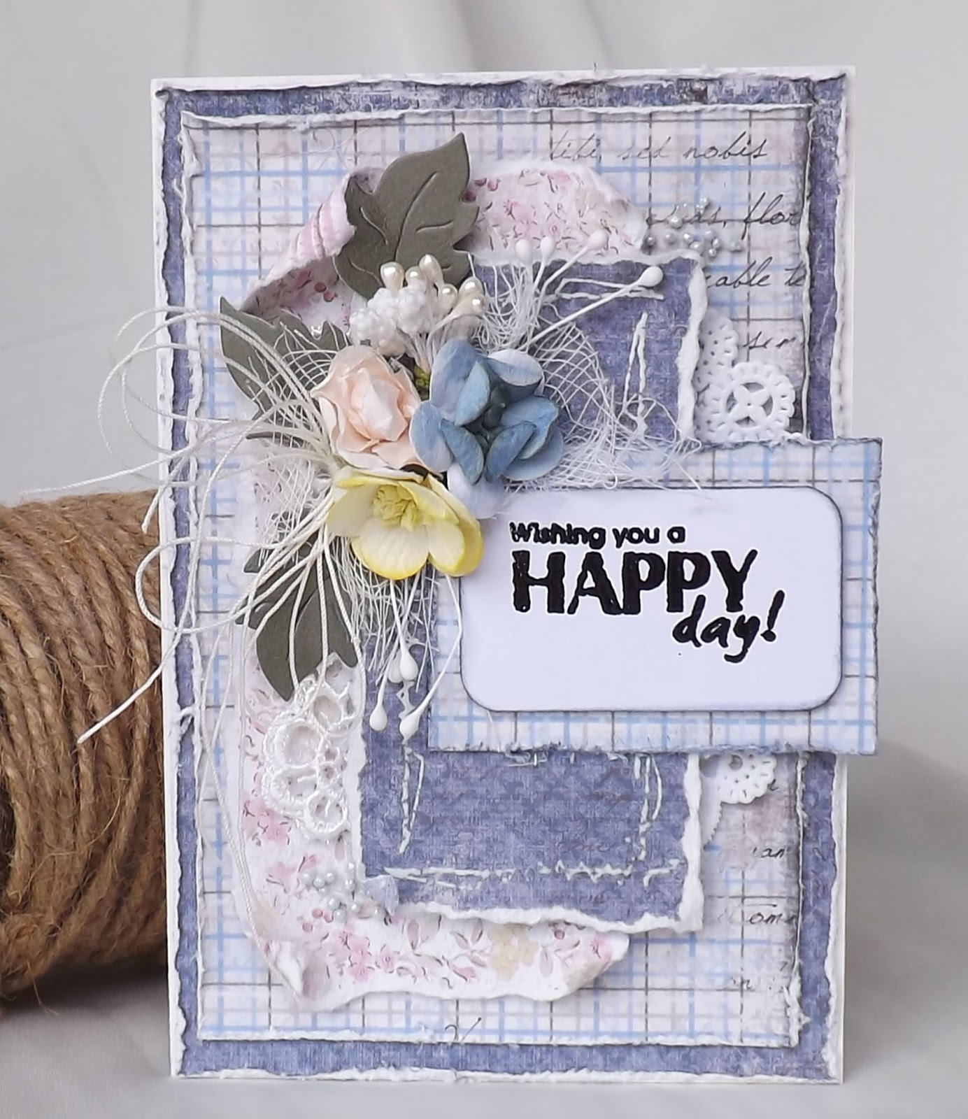 Hello everyone! My card was created with papers from Maja Design and some pretty flowers and lace from Megs Garden. The leaf die is by Cheery Lyn and I have added a piece of gauze and a twine bow to the cluster. The sentiment was stamped onto a piece of cardstock and heat embossed.