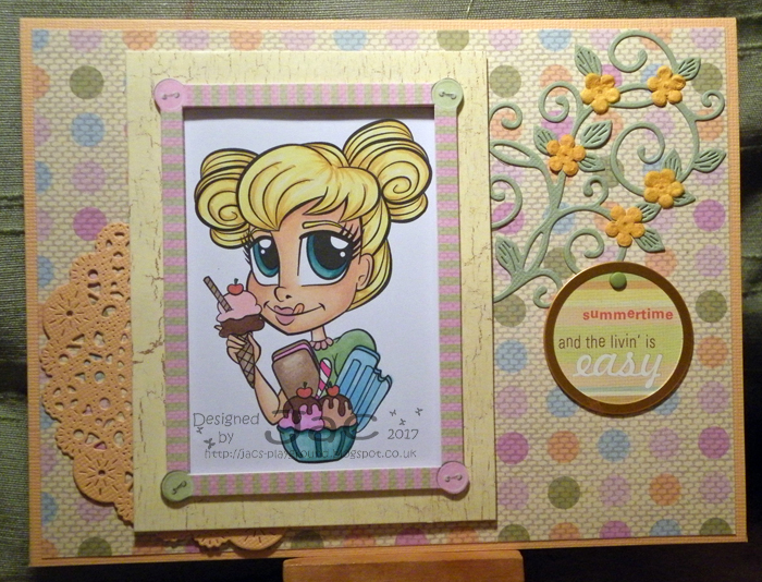 So what says summer more than ice cream! For my card I have used the adorable Ice Cream Izzy from Simply B stamps, coloured up with copics and chameleons papers, paper is K & Co as is the frame and metal rimmed tag, added a die cut doily and leafy swirl and finished off with some little prima flowers and a candy dot