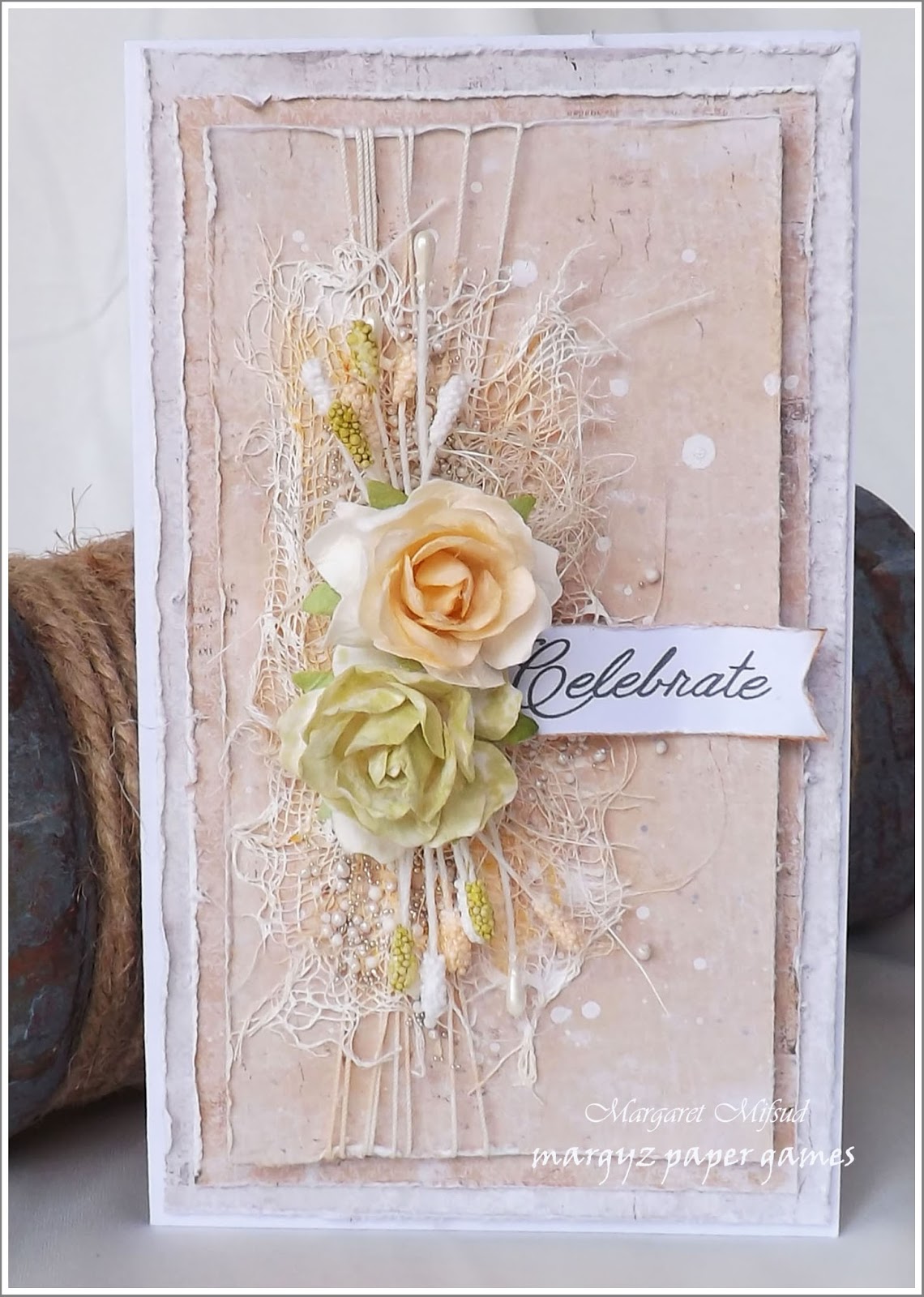 Summer to me means hot days, and lots of flowers in the garden. My card is made with papers from the Vintage Summer Basics range by Maja Design and I've added some pretty flowers, sisal, twine, gauze and lots of prills and micro beads.