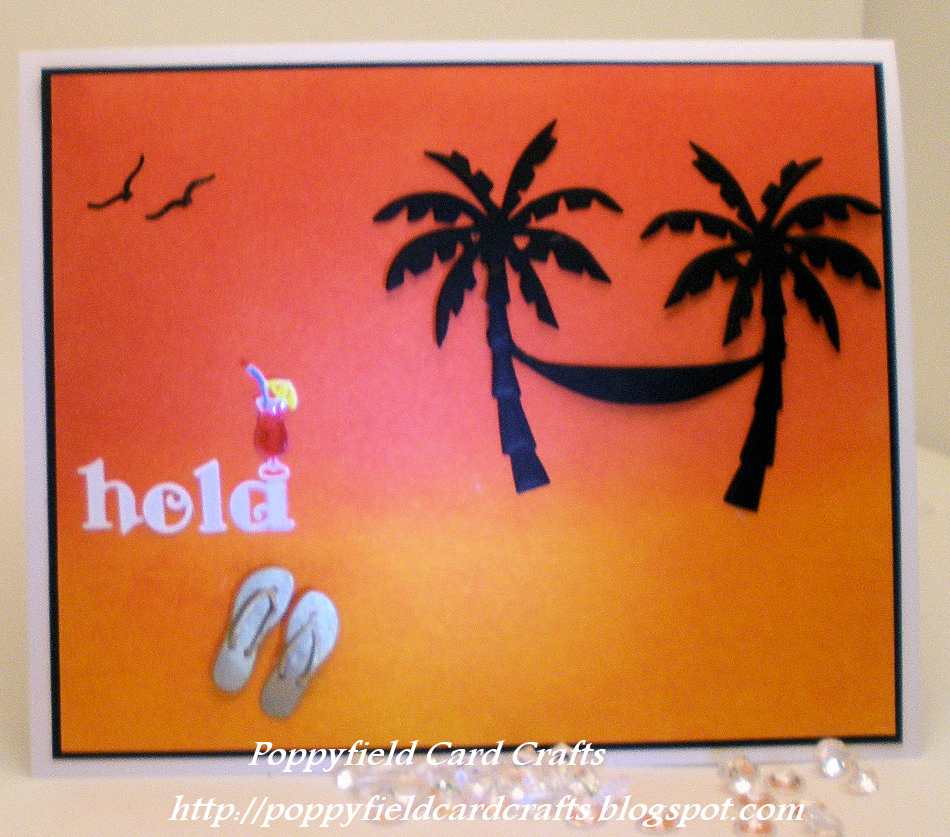 I used 2 Distress Inks to colour my white card, giving it a tropical look. I die cut the embellishments and chose the word 'hola' in keeping with the tropical theme, and added a cocktail above the letter 'a'
