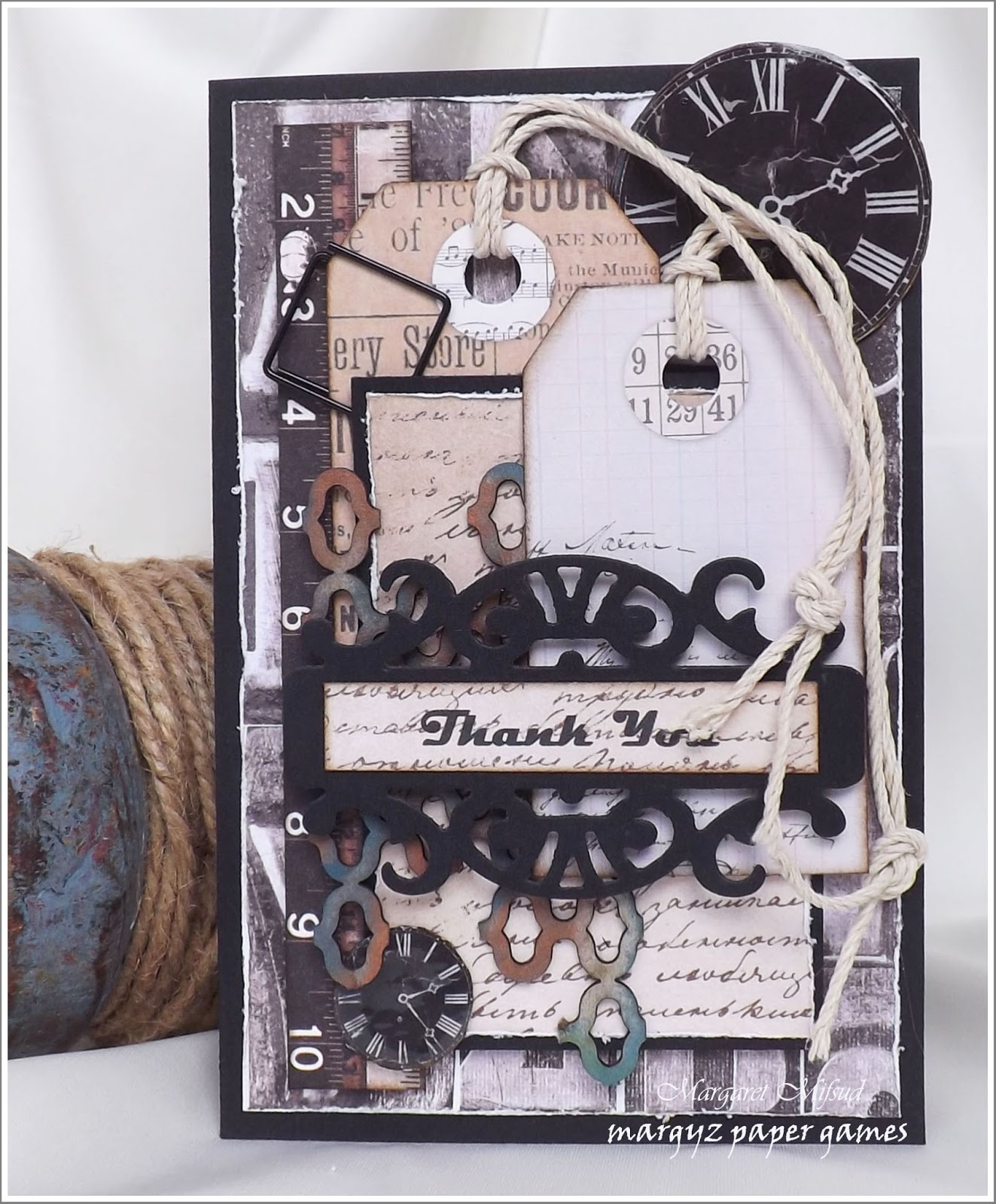 Hello everyone! My card is a rather masculine one. Lots of layers with Kaisercraft and Prima papers. As well as the tags, I have added a piece of 2Crafty Chipboard (coloured with VersaColor Stamp Pads), a metal clip, a Spellbinders die cut, two handmade clock flairs and some knotted twine.