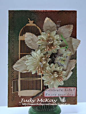 My card is very simple. I used part of a Masterboard I created a while back for the background. Simply adhered it to a card blank and then added a die cut, a few flowers and prills and a computer generated greeting. Looking forward to seeing how you interpret this Theme! Have a lovely day!