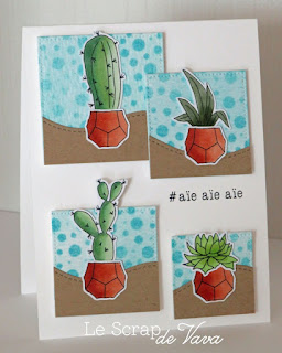 For me this challenge was an easy one because I don't use often patterned paper on my cards. I started by inking a blank watercolor cardstock then I used a stencil and cut 4 squares from it. I added a border with a die for more interest. Then I stamped, coloured and cut my images. For the finishing touch I added a fun sentiment. Et voilà!