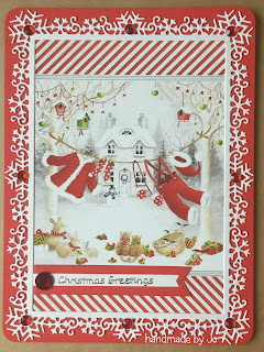 I made a Christmas card topper this time, I layered an image from Hunkydory onto a piece of red card then added a white die cut frame & finished with a few gems & a Christmas sentiment on a layered banner die embellishment.