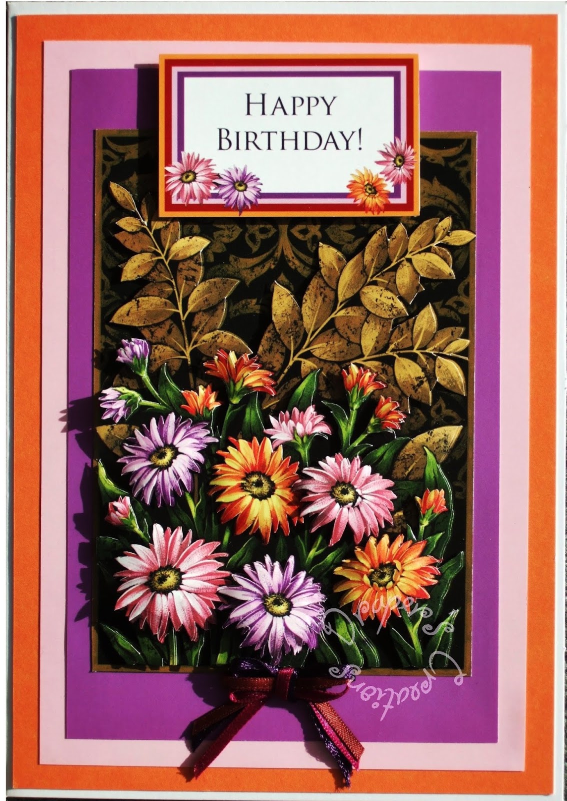 I created this card using one of Jane Gill's lovely floral designs. The central panel has been created with white embossing and colourful distress inks to give my Explosion of colour.