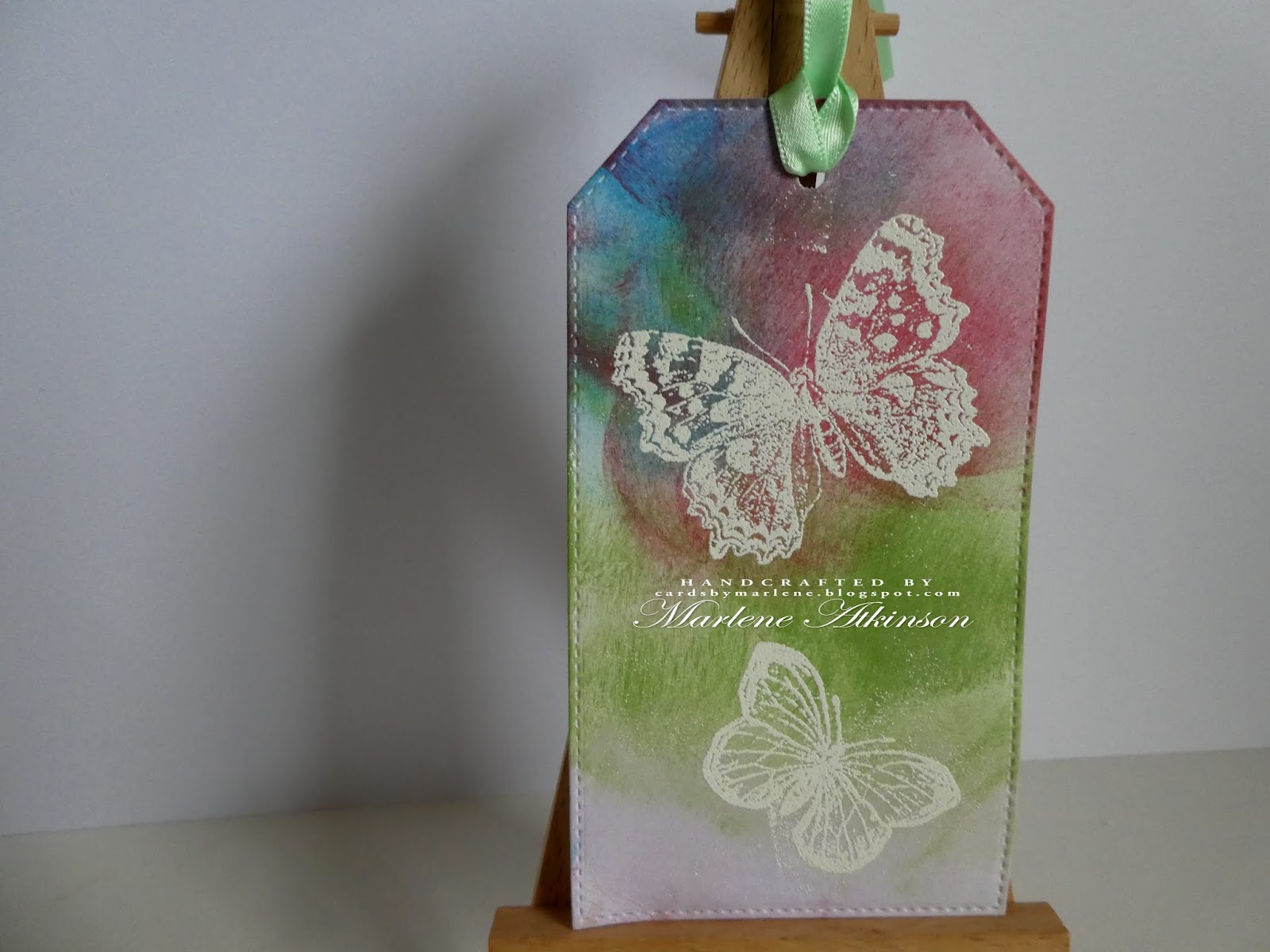 To make this tag I used a lot of Distress Inks Butterfly Stamps and embossing powder, and added some Ribbon