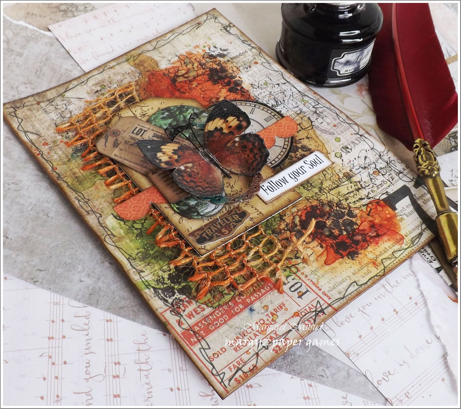 I have created an Art Journal page. The base paper is by Tim Holtz and I have used Lindy's Stamp Gang Magicals to add the colour. Added stamping, a bit of fibre ribbon and lots of layered ephemera to complete the page. Looking forward to seeing your creations! Have fun!!
