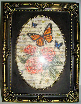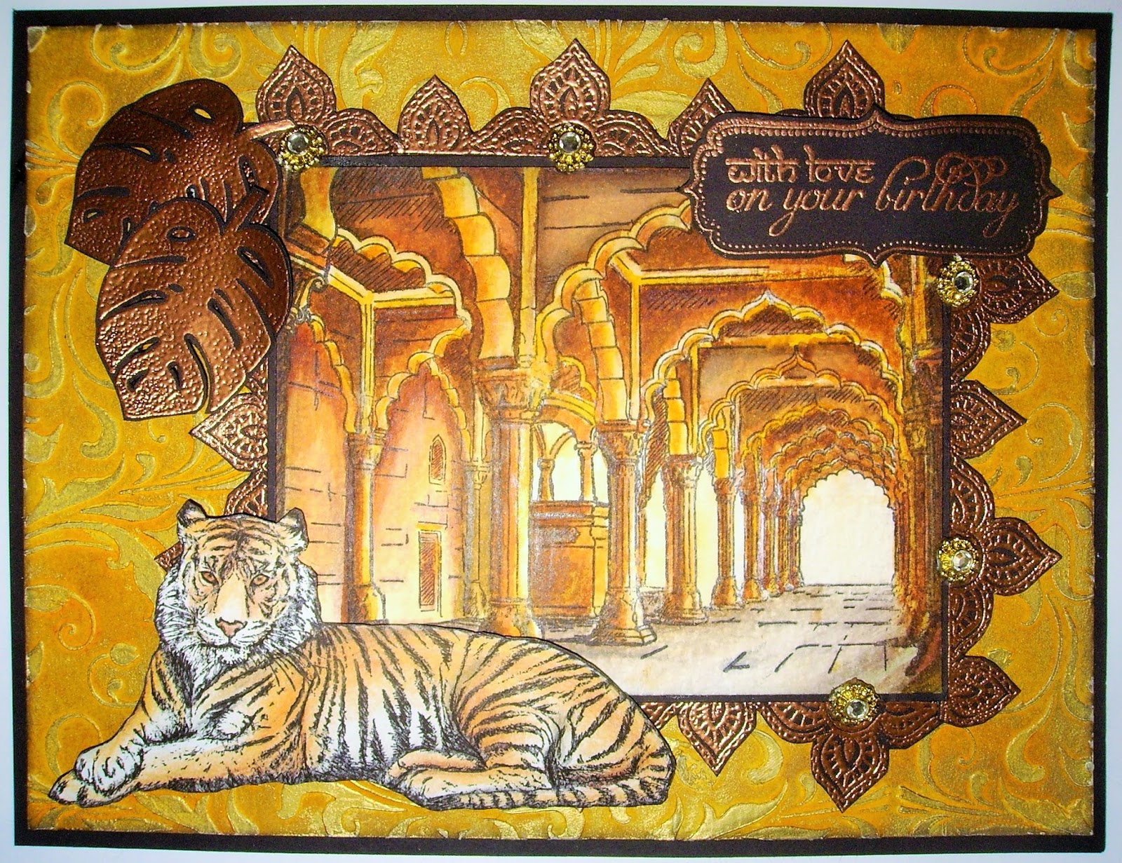 My card was made using a rubber stamped image coloured with promarkers, an embossing folder and some distress inks to make my base layer, and some black card to make the tryptich topper "pop".