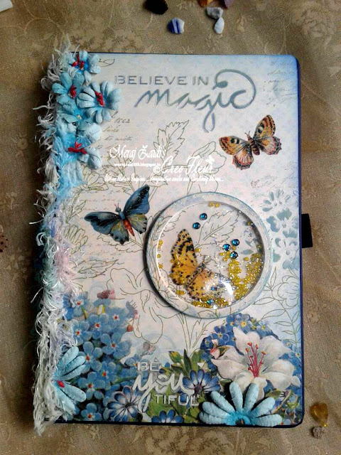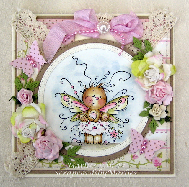 I love adding flowers to my feminine cards so I really enjoyed the theme on this Challenge. Papers used are from Maja and I have added a piece of lace at the side and also did a little stenciling with translucent texture paste. Added some gauze under the flower cluster and included a few berries, gem sprays and die cut leaves as well as some randomly scattered prills.