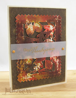 This is a layered card with one of may Masterboards as the base, stamped acetate above and finished with Tim Holtz dies, black brads and a metal embellishment. Happy crafting, Angela xXx