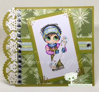 For this, I've used a free stamp from a magazine, coloured with pencils and edged with Distress Ink. The background uses acrylic paint, stencils and my gelli-plate.